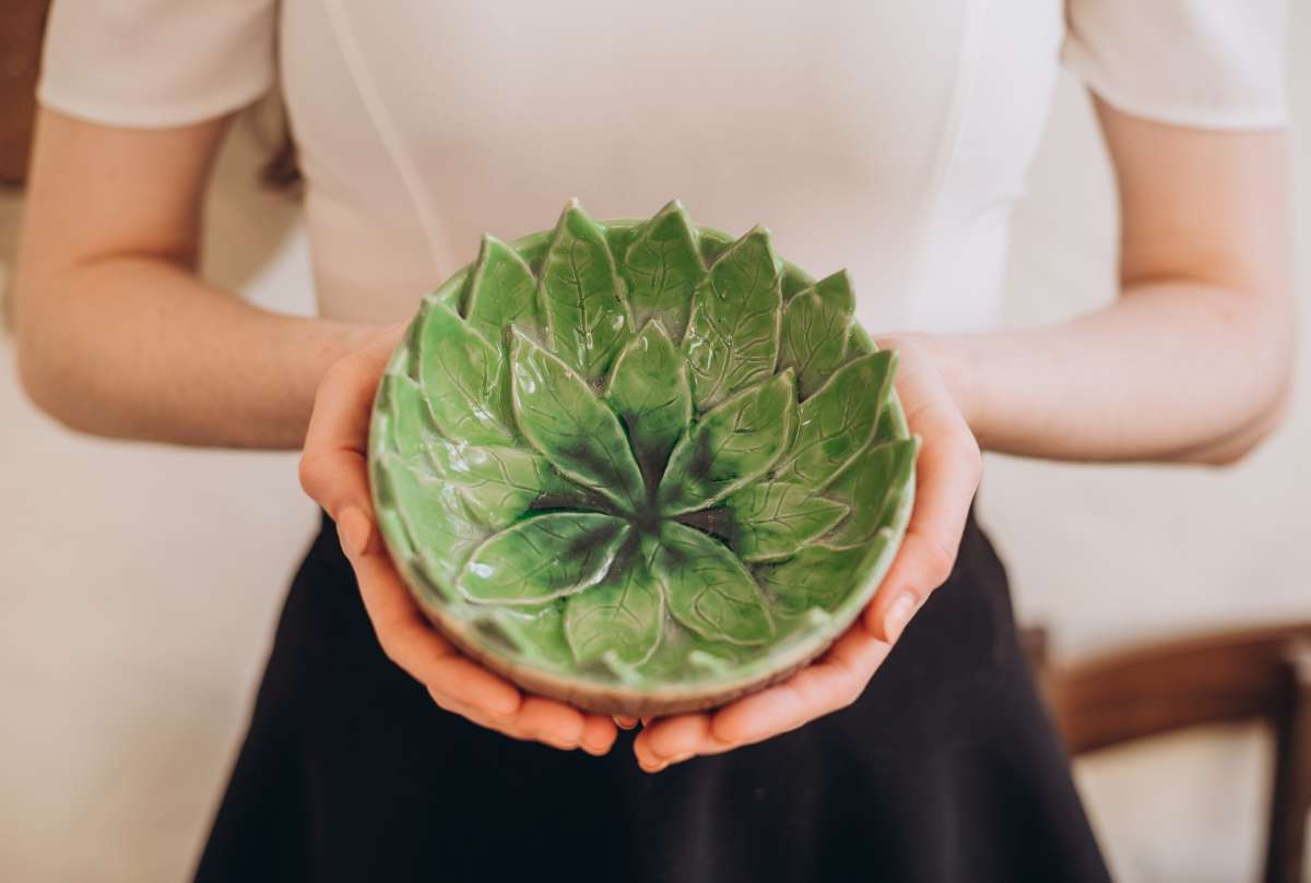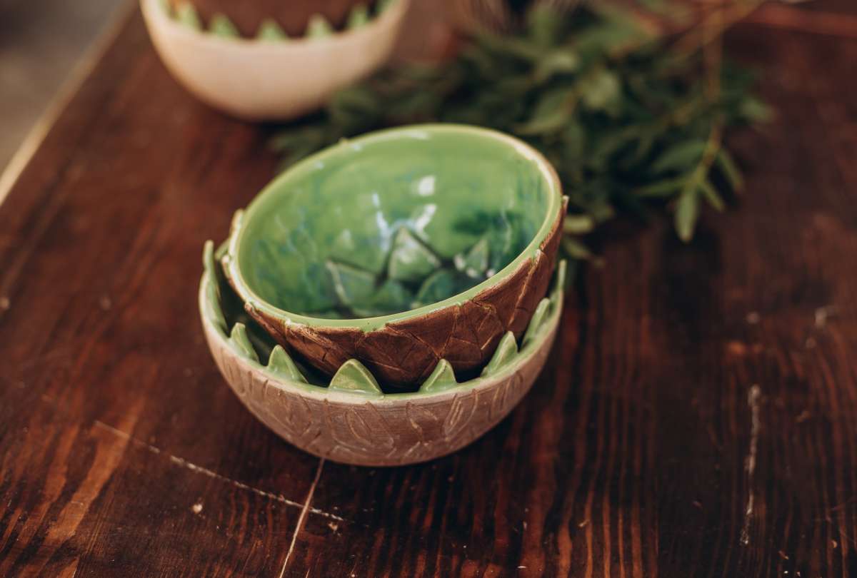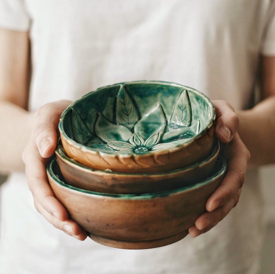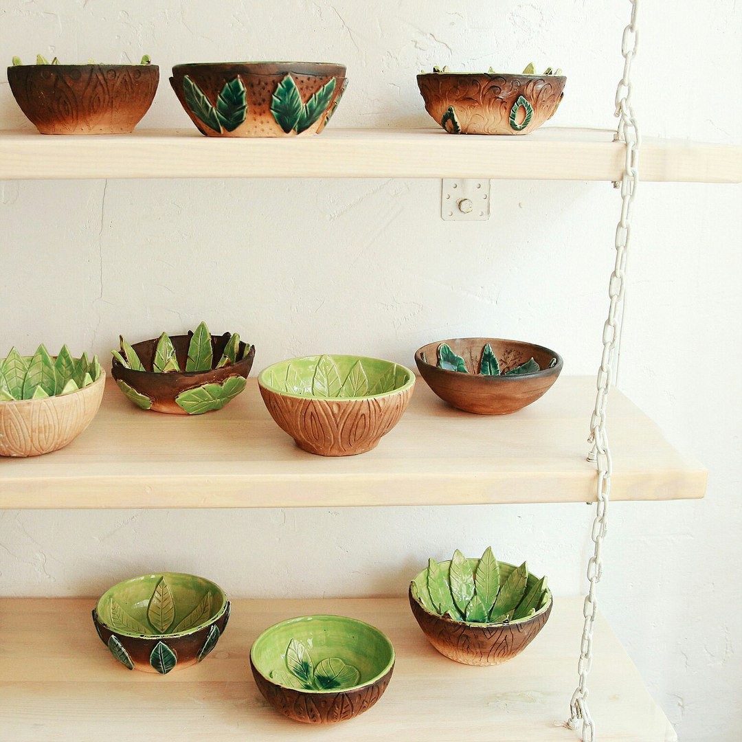 На этом мастер-классе вы за гончарным кругом выкрутите миску, а потом наклеите внутрь листья, которые сделаете вручную. Можно воспользоваться шаблонами, а можно придумать форму листьев самостоятельно. Внешнюю поверхность салатника можно дополнительно задекорировать фактурой коры. С помощью молочения глине придается мягкий коричневый цвет, и узор становится просто восхитительным.