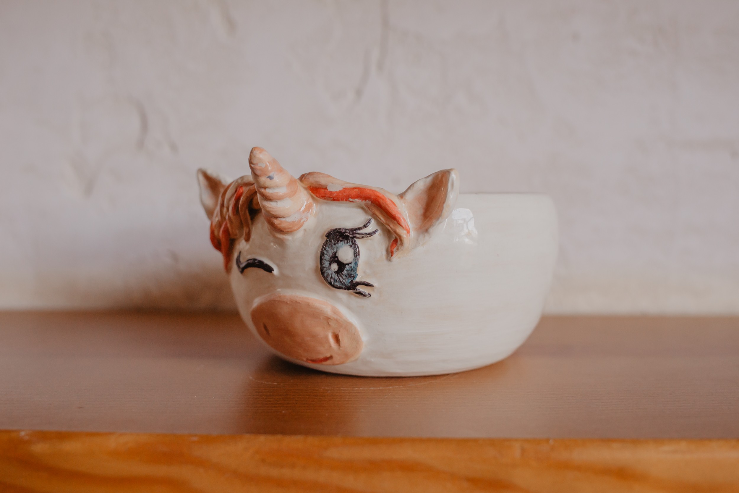 После всех технических сборов порядочных единорогов полагается раскрасить всеми цветами радуги, что дети с удовольствием и делают. Раскрашивают мордочки, гриву, уши, хвост специальными безвредными красками. А внутри выбирают яркую глазурь, который мы покроем после первого обжига.