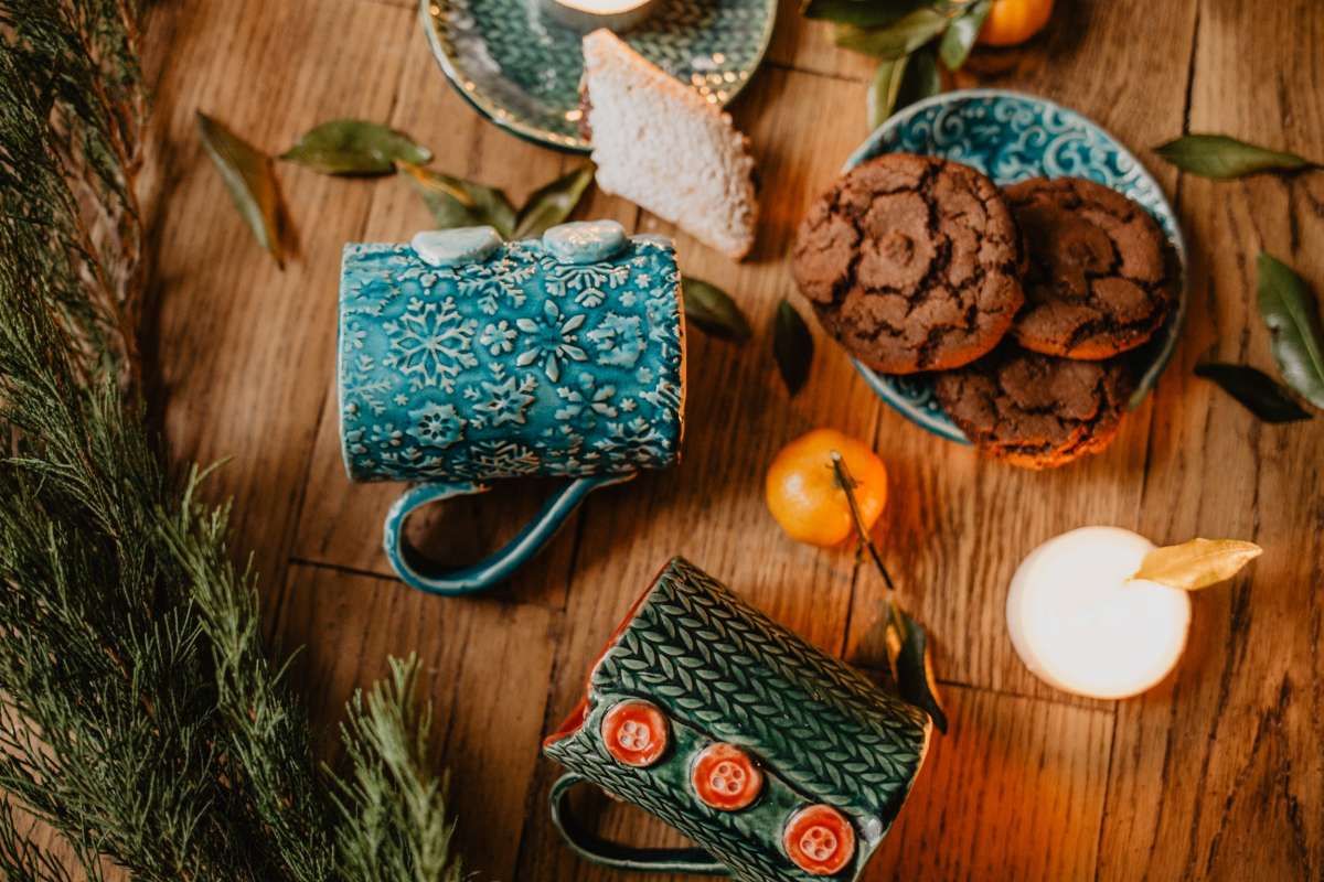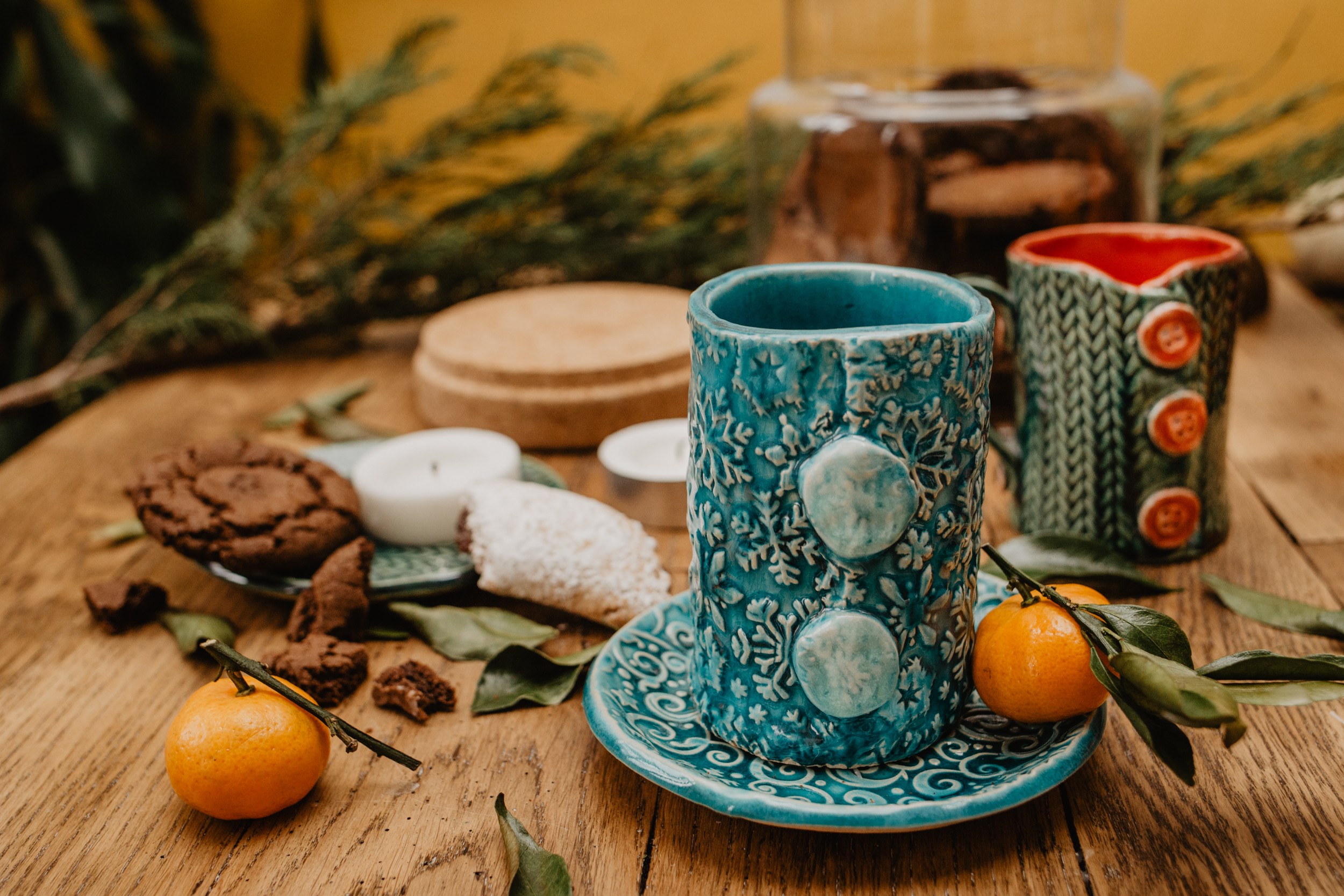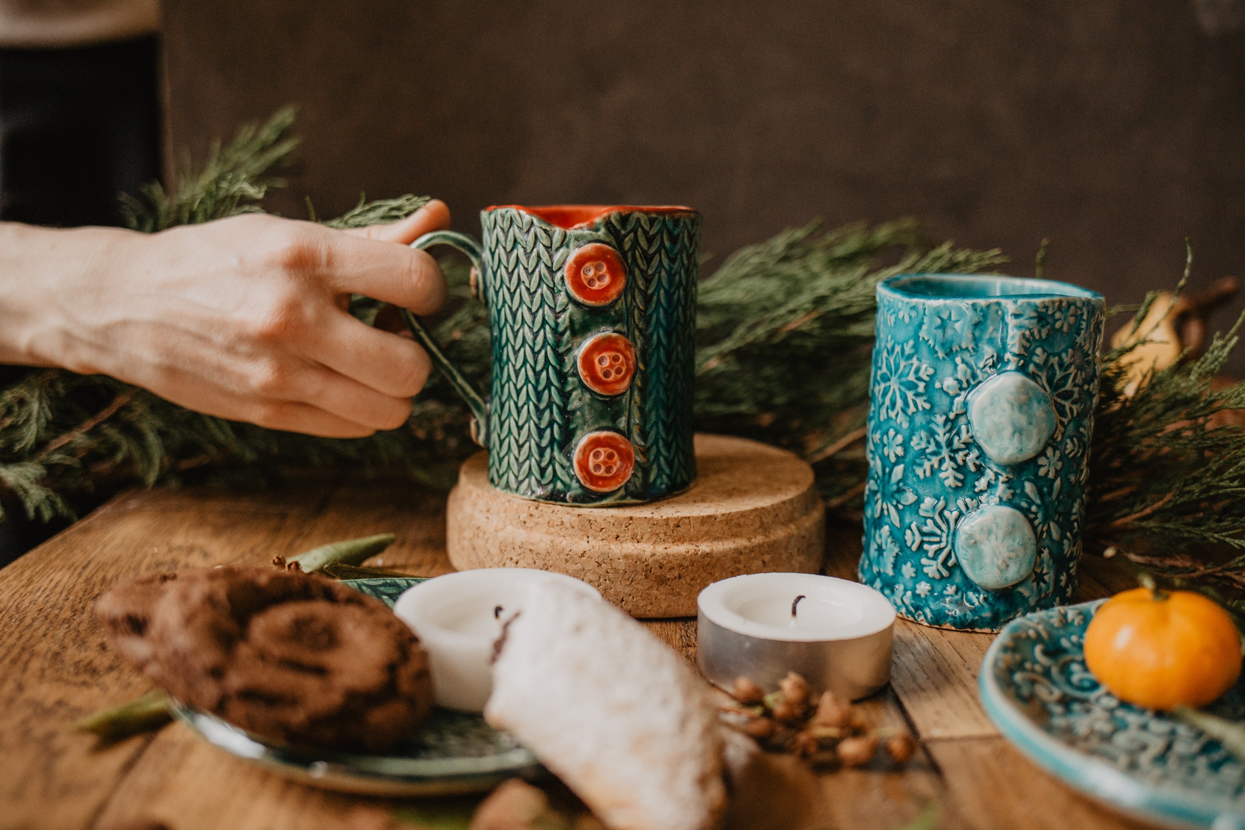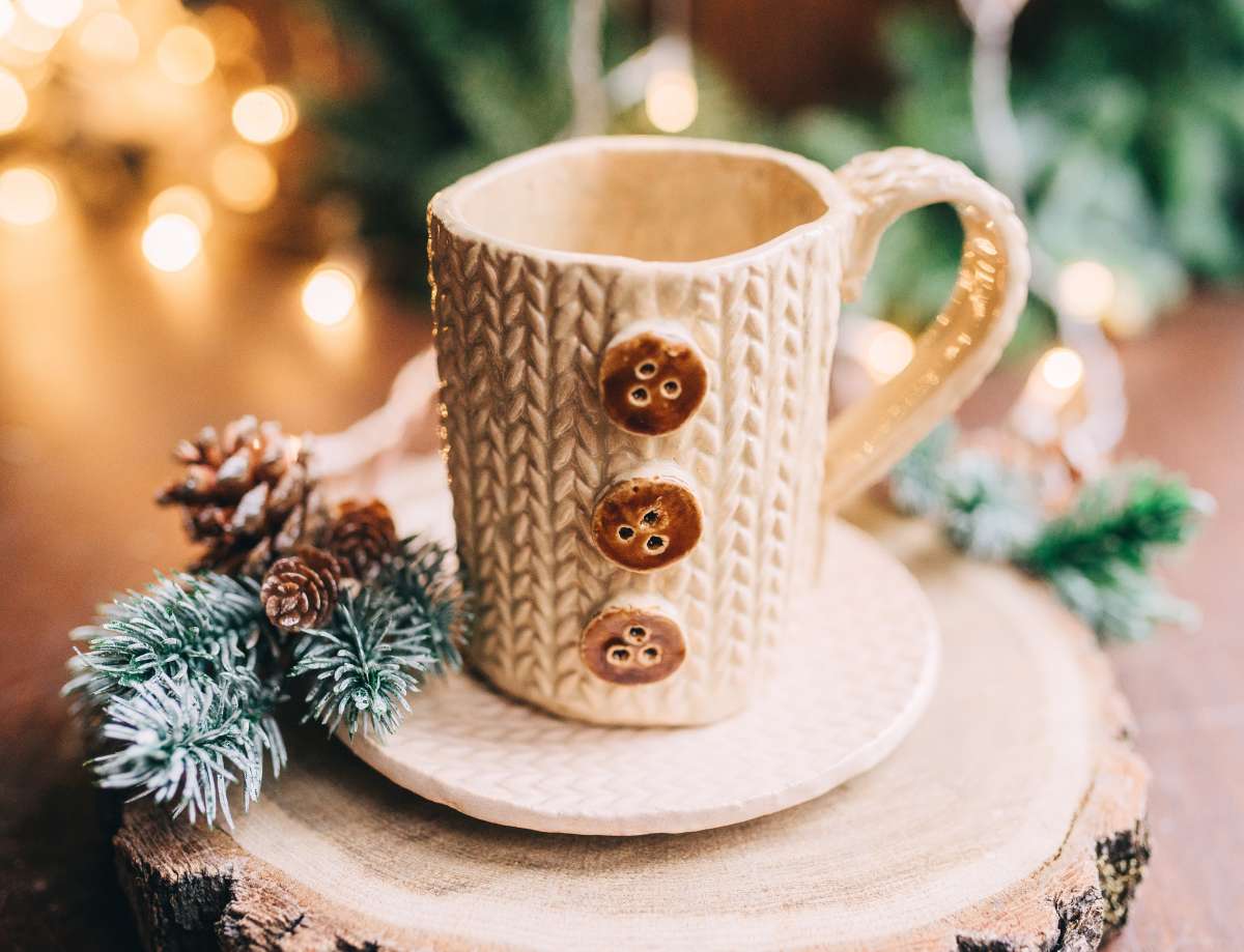 Наши самые теплые кружки - можно даже на пуговку застегнуть. Когда мы первый раз использовали текстурную скалку с узором вязаных косичек, то поняли - это будет надолго и очень по любви. Вязаные кружечки окончательно покорили наши сердца, почему?